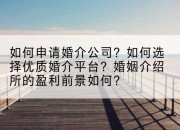 随着现代社会节奏的加快,越来越多的人选择通过婚介公司寻找人生伴侣。申请婚介公司、选择合适的婚介平台成为了人们关注的焦点。同时,关于开设婚姻介绍所是否盈利的问题也备受关注。下面,我们就来探讨一下这些问题。一、如何申请婚介公司?申请婚介公司需要经过一系列步骤,首先要进行市场调研,了解当地婚恋市场的需求和竞争情况。然后,选择合适的公司类型和经营场所。接着,办理相关手续,如工商注册、税务登记等。在此过程中